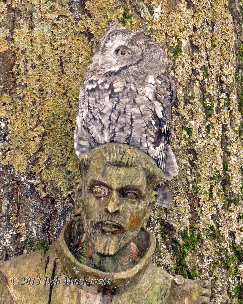 Eastern Screech Owl Megascops asio There is an amusing scene in the comedy “My Cousin Vinny”, where the Joe Pesci character, an inexperienced lawyer from Brooklyn, where local wildlife tends towards pigeons, rats, crows, and stray cats, is staying in a remote back woods Alabama cabin, preparing for the big murder trial, and is startled by a blood curdling shriek in the dead of night. He explodes out the front door, wildly firing a pistol, as the camera suddenly focuses down on a small screech owl in a tree. Eastern Screech