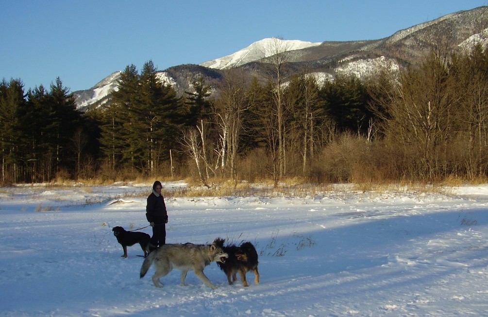 occasional fleeting glimpse of one. You'd better have understanding neighbors, or better still no neighbors, because your hybrid will want to howl, when the mood strikes him, and your neighbors may not find the experience as haunting and melodic, not to mention convenient, at 2:00 AM, as you might. Our nearest neighbors are a 1/3 of a mile away, are themselves nature lovers who don't mind the occasional choir, and we're landlocked on our property in such a manner that we'll never have closer neighbors. In fact, the Adirondack Mountains is one of the most sparsely populated regions in the United States. In addition, we run our business out of our home, so we are basically always around to investigate whatever gets Cree's attention, whether it's the howling of the local coyote pack, the raucous squawk of a raven, or the piercing scream of a bobcat. Our bedroom and our office is bounded on two sides by the wolf enclosure, such that we are almost never out of visual and/ or audible range of Cree and Zeebie. You'll need time to exercise your hybrid. Cree and Zeebie hike with us at least two miles every day, rain, shine, warm weather or sub-zero. This is not only healthy and fun for all involved, but it helps build both trust and dependency in your pet. Our first hybrid, "Chino" hiked all over these Adirondack High Peaks, and was an ongoing good-will ambassador for properly-raised wolf-dogs, because people saw how calm and good-natured he was. Continued below.... |